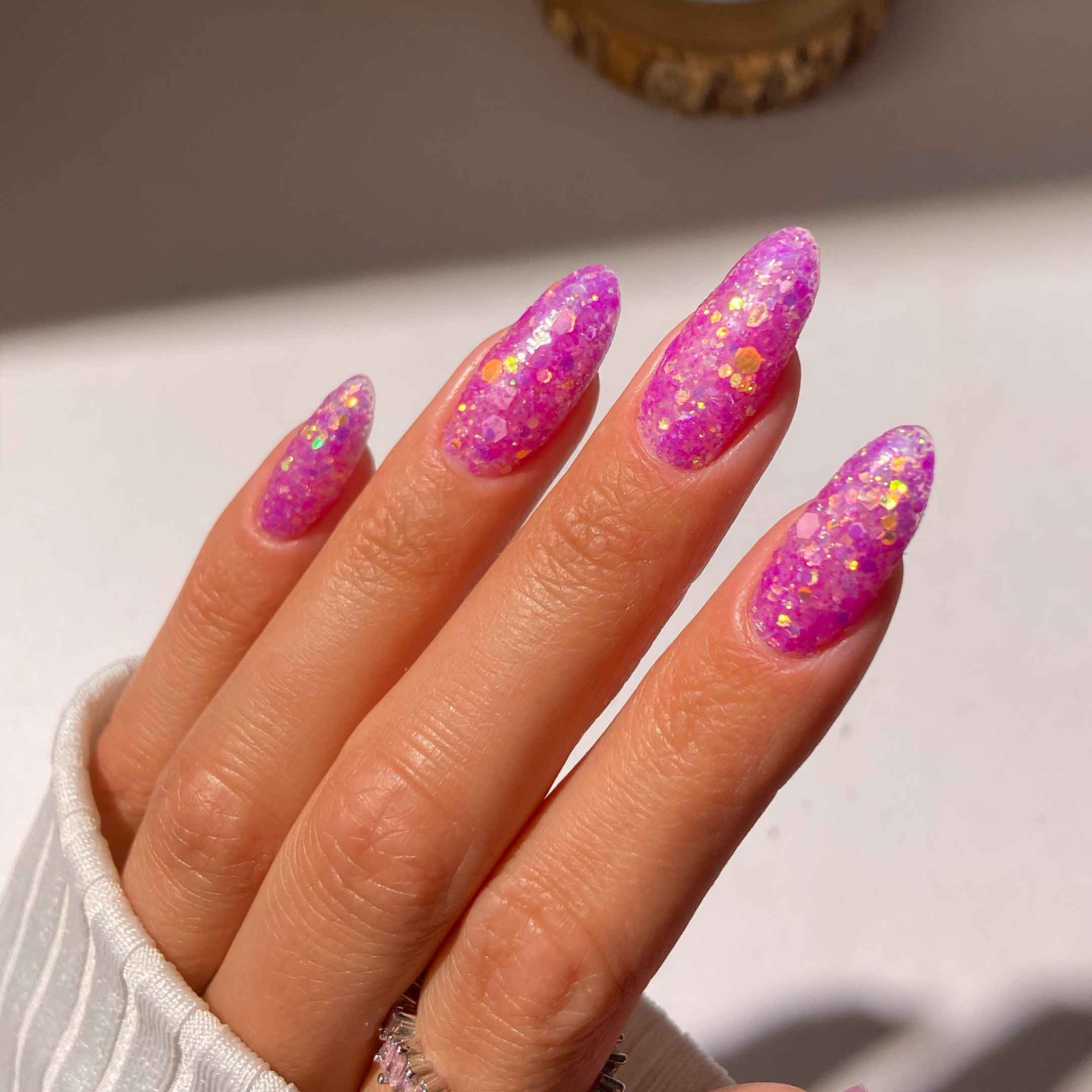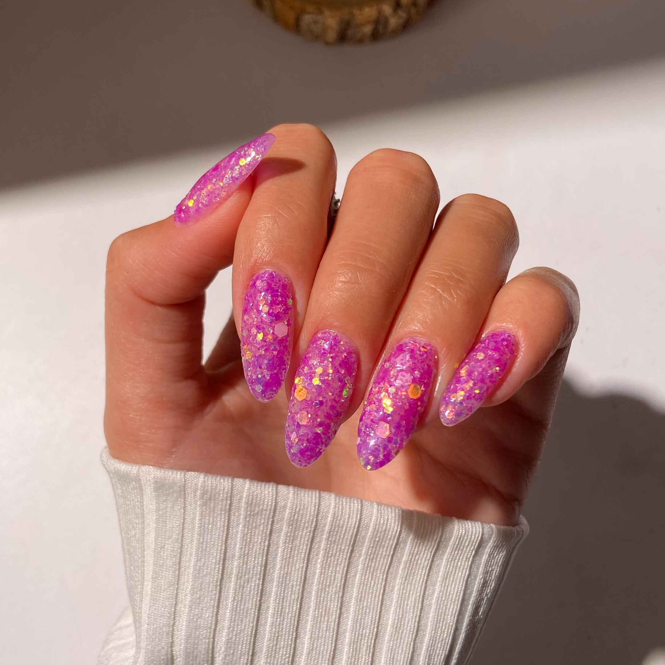 Jelly Drop is a vibrant purple featuring a dazzling blend of light-catching flakes to bring a touch of magic to your manicure. It is the perfect way to add a lively and playful finish to your nails.
