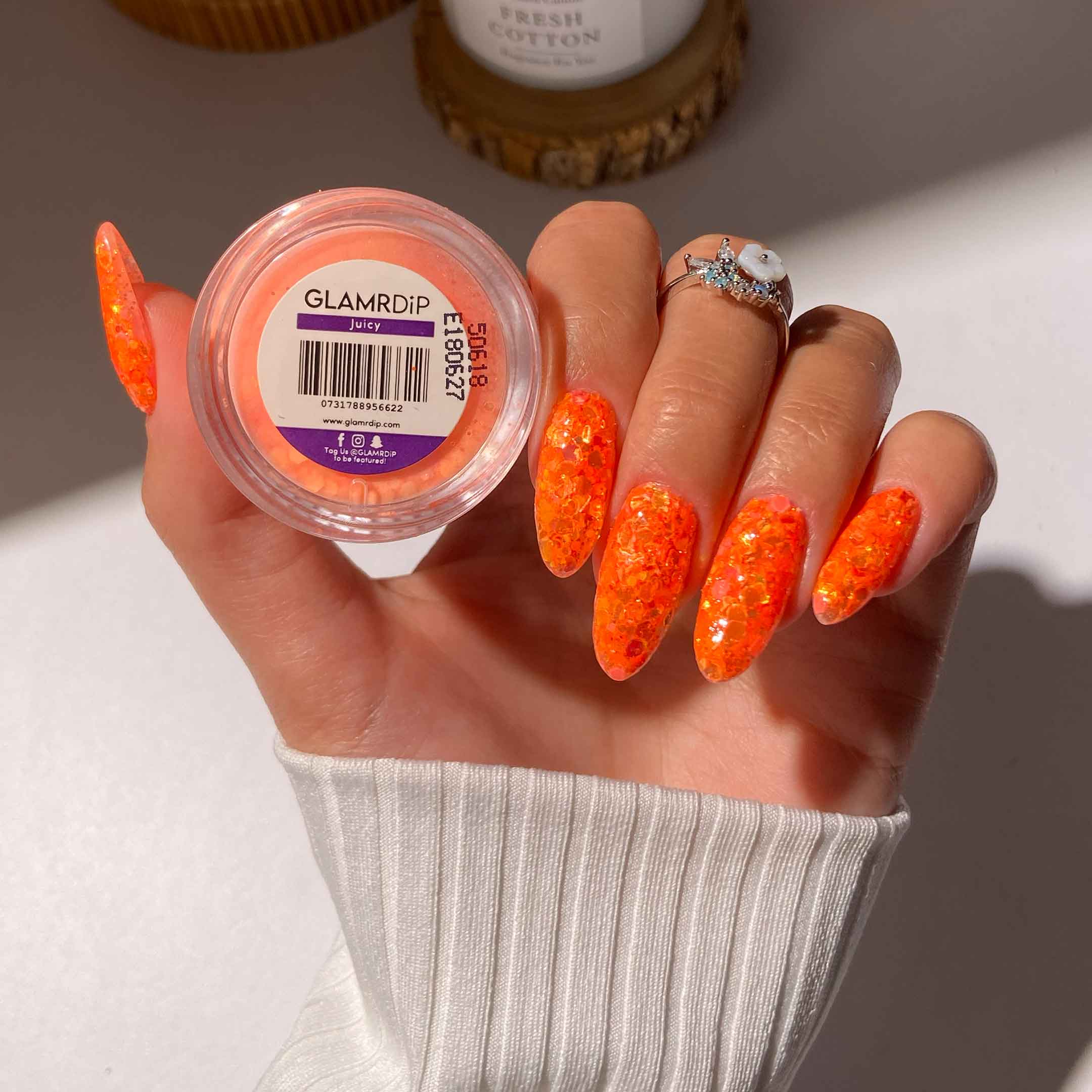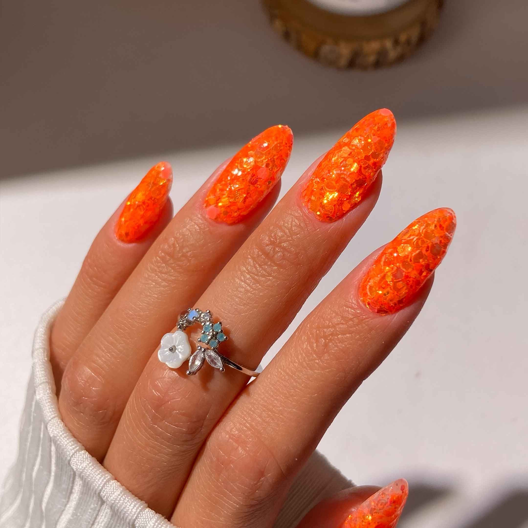 Juicy is a mouth-watering bright orange featuring a stunning mix of light-catching flakes for a high-shine finish. It's the perfect bold shade for a fun and energetic summer vibe.